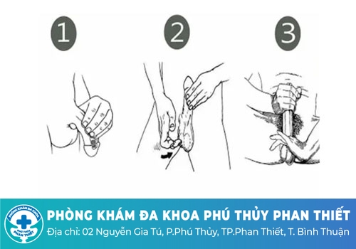 ⇒ Sử dụng tay rút bao quy đầu, đồng thời nắm lấy dương vật tại điểm cách đầu của dương vật khoảng 2cm.